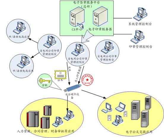 电子签章的应用及部署模式分两级:一是南方电网总部到各省电网公司、分公司、子公司之间联网的应用;二是各省电网公司与各地市供电局、直属单位之间的全省联网应用。从而实现南方整个电网行业的电子公文、电子印章互信互通。