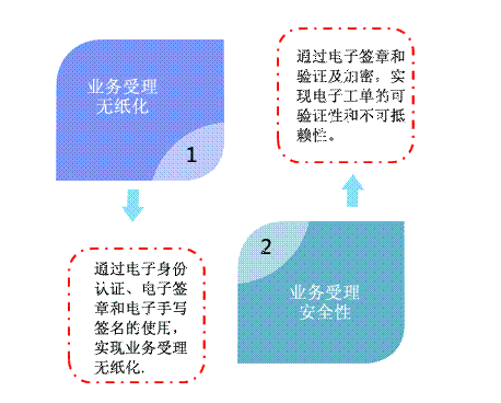 现状分析:随着该分公司用户数的不断增长和各种业务的相继推出,每天办理的业务量也飞速增长,目前全省1-10月营业厅每月平均打印工单量约为76万张,大量的纸张需要花费巨额的印制成本,并且消耗大量的资源,不符合绿色节能的发展要求。同时纸质工单需要占用很多仓库资源,后期的稽核查找也非常不方便,而且需耗费大量人力时间。同时随着国家电子签名法的颁布实施,电子业务受理单成为可能,中国移动各地分公司正在尝试电子化处理流程。