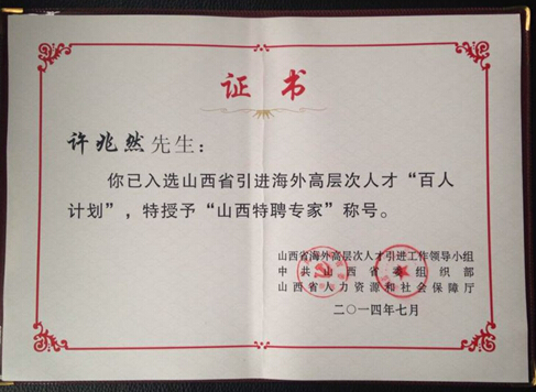 许兆然博士荣获山西第七批“百人计划”特聘专家称号
