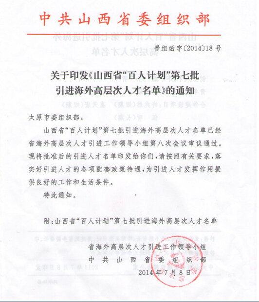 近日,山西省太原市委组织部公布了山西省“百人计划”第七批引进海外高层次人才名单,许兆然博士名列其中,是山西今年入选“百人计划”的5位专家之一。
